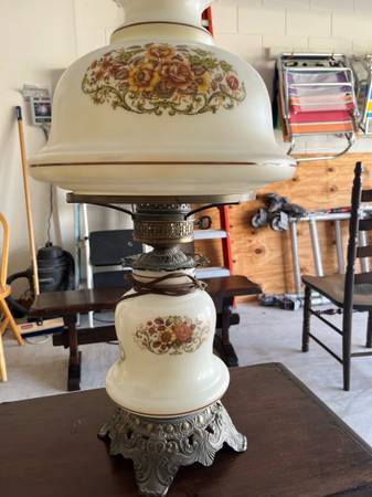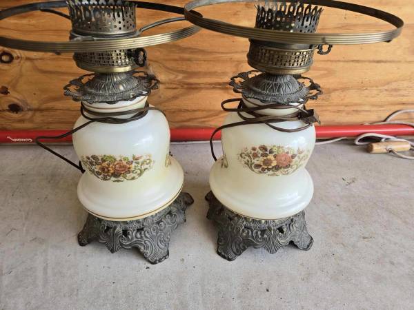 2 large vintage glass and brass “gone with the wind”style Victorian lamps with flower motif. Chimney inserts. PRICE IS FOR EACH LAMP, available as single purchase or negotiable if purchased together. Excellent condition. Serious buyers only, please respond through CL message where to arrange pickup and answer any questions you might have. Cash only on pick up. If ad is up item is still available.