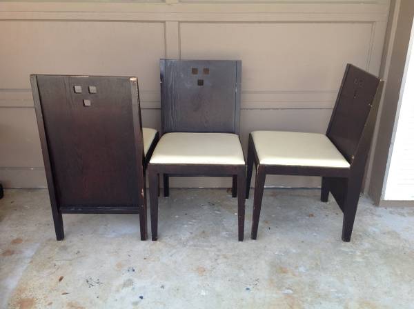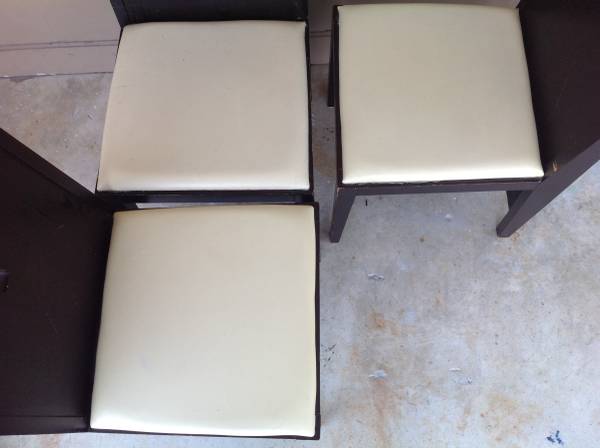 3 dark stained wood dining chairs with white pleather seat, some wear and nicks need refurbishment