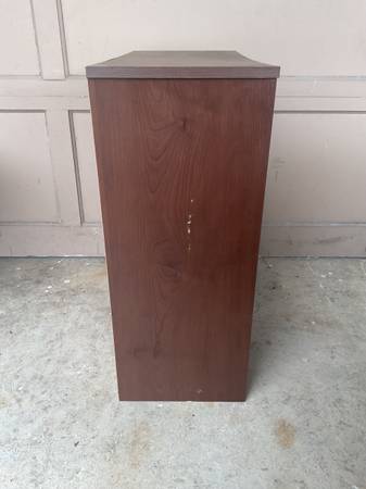 dark brown laminate over composite wood frame shelf unit, has 2 shelves and 2 cubicles, unit is 25.5” x 11.75” x 28.5”, minor wear