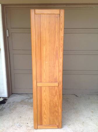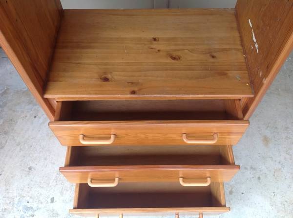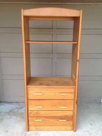 semi light wood storage cabinet, has 3 drawers and 1 position adjustable shelf, unit is 31" x 18" x 72" and shelf is 28" x 15", minor wear all drawers work, I have a trailer and willing to deliver...