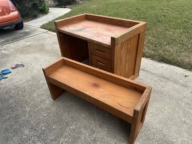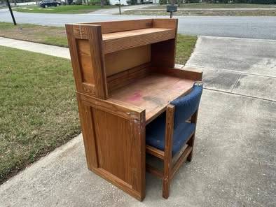 Solid wood desk set with lighting hutch and matching chair. The desk has a deep workspace, drawers for storage, and a built-in overhead light. The hutch adds extra storage and display space. The chair is wooden with a blue cushion that needs reupholstering. The desktop shows wear and could be refinished with a quick sanding and staining or painting. The light in the hutch works fine.
