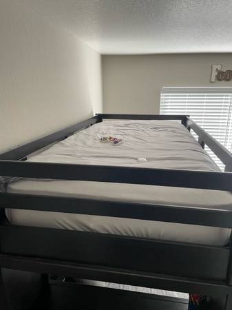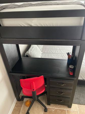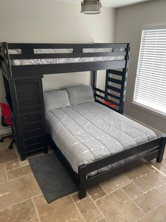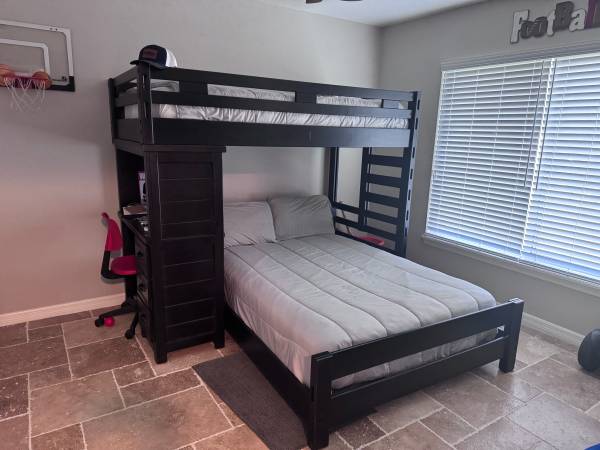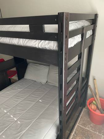 Bunk bed set with everything included (mattresses /bedset/office chair). Like new condition. Twin top bed full bottom bed desk with drawers and rolling office chair. Made from all real wood no pressboard or plastic.