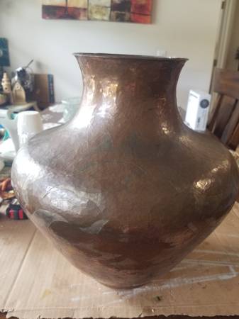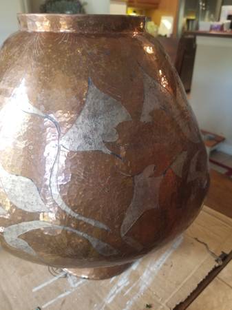 very nice heavy solid hammered copper with inlays vase measures approx: 14" tall x 14" at widest part would look great with some Pompas grass in it