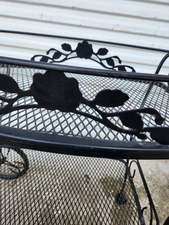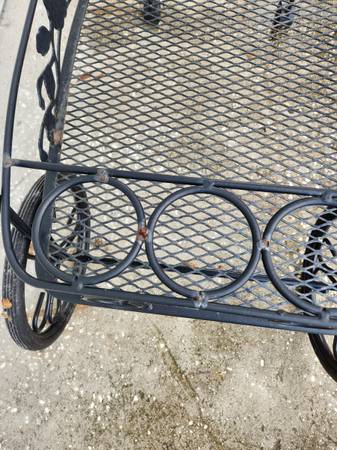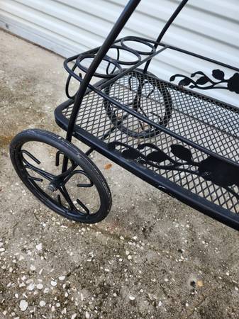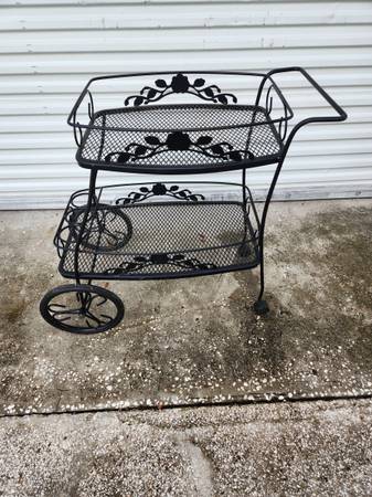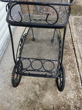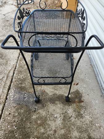 Black metal bar cart server. Great for patios. Has some slight surface rust--can easily be painted. Measures 40"L x 21"D x 34"H. Cash sale. Pick up at warehouse in Tavares. I respond by email.