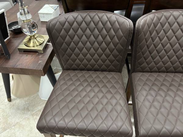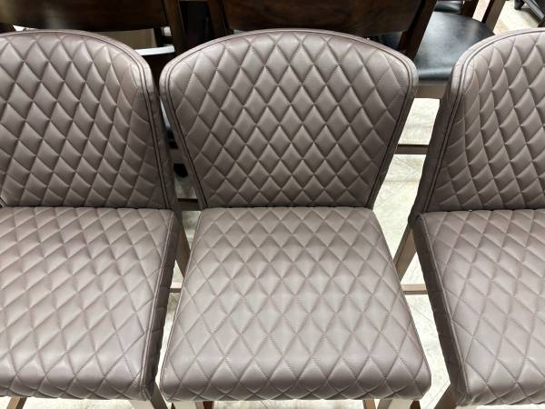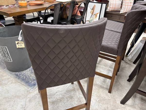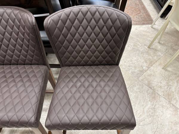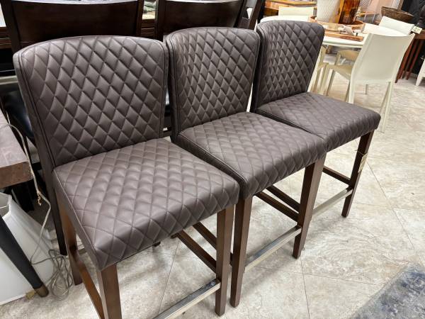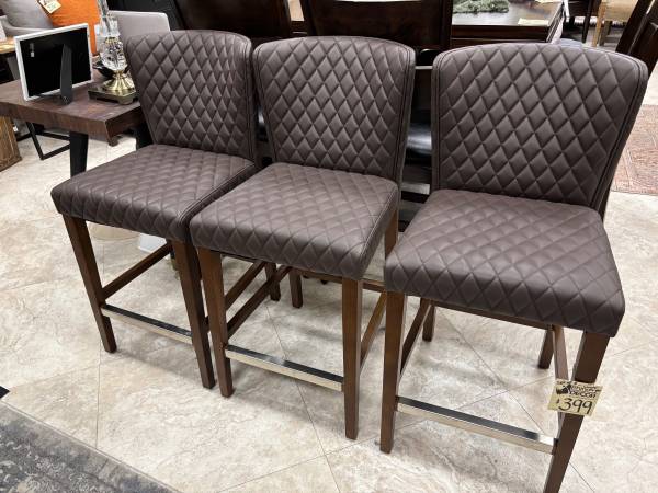 3 Brown Stitched Leather Counter Stools Like New Condition Staged in Model Home Counter Height Seats Dimensions are 18” x 24” x 38”H $399 for the set -