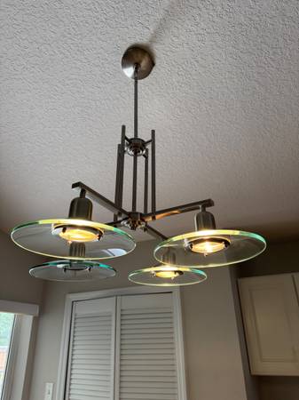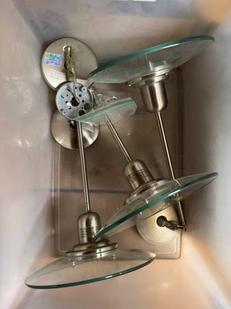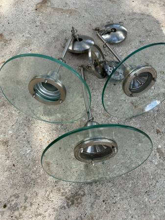 Stainless steel ceiling lights with glass components. 1 set of 4, and 3 individual lights. All in excellent condition Takes 50 watt Halogen bulbs. Very nice warm light. Beautiful in kitchen.