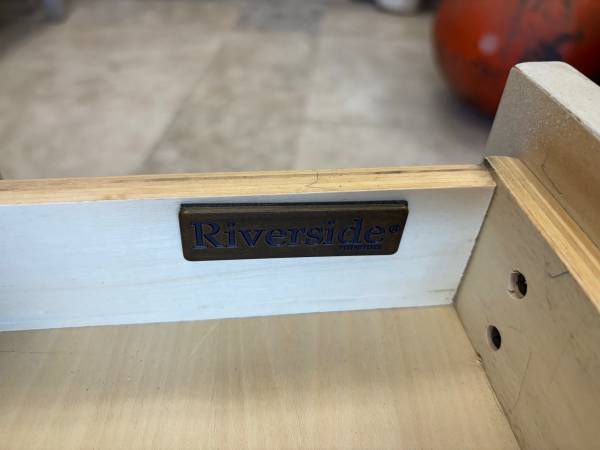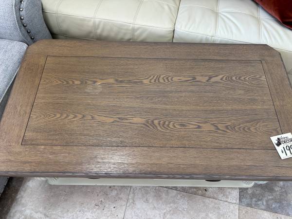 Off White & Weathered Wood Coffee Table Good Condition 2 Drawers, On Wheels Dimensions are 48” x 26” x 19.5”H $199 -