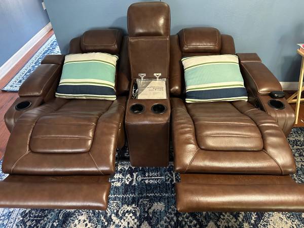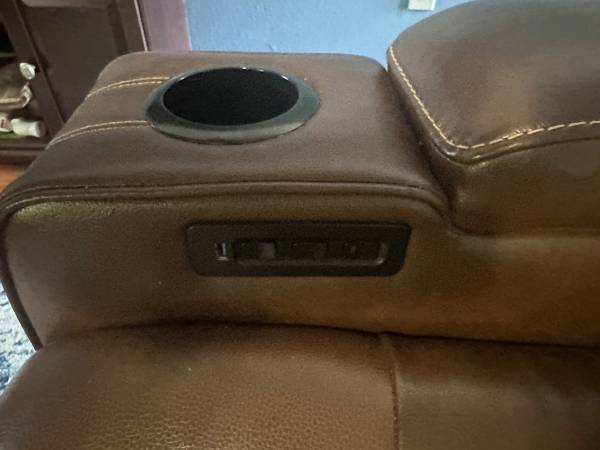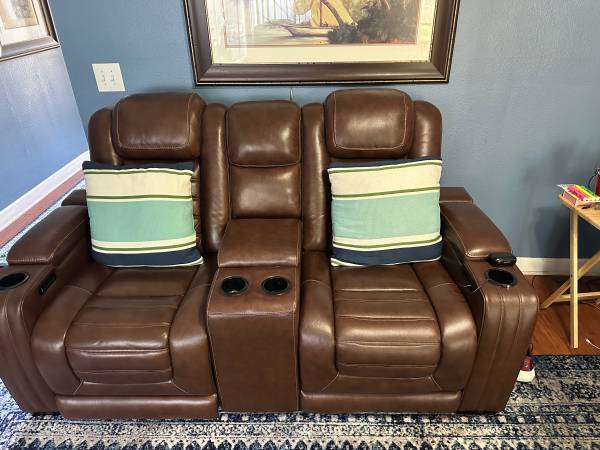Brown love seat with center console in mint condition real leather made by Ashley furniture.