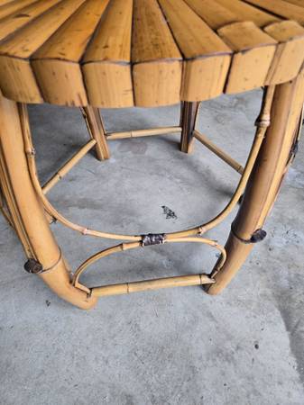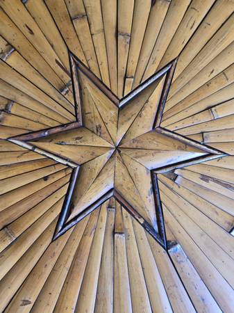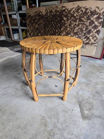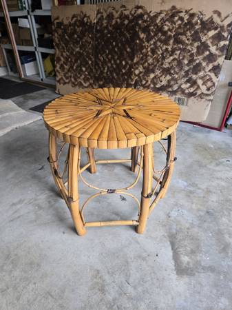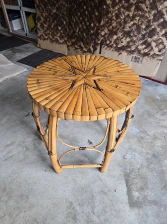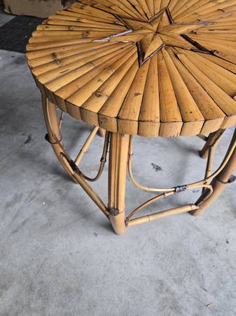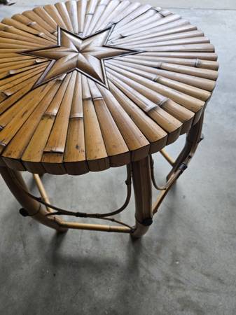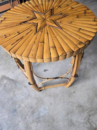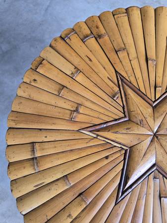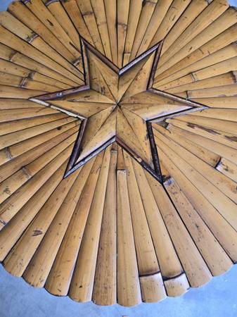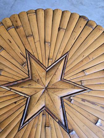 Custom design a bamboo table that has a unique star in the middle of the table. The table has many different designs that makes it very appealing. For the age of this round bamboo star table it is in excellent condition. The table is 21.5" tall & 23" in diameter.