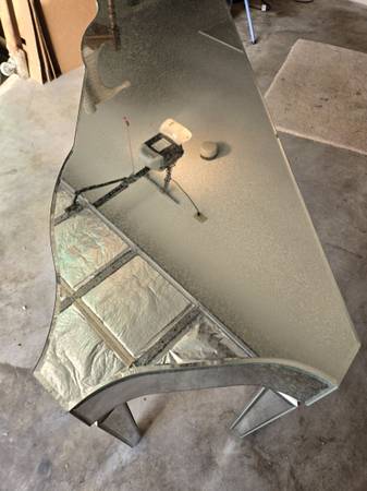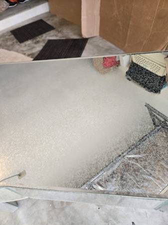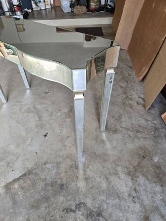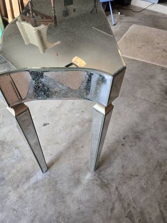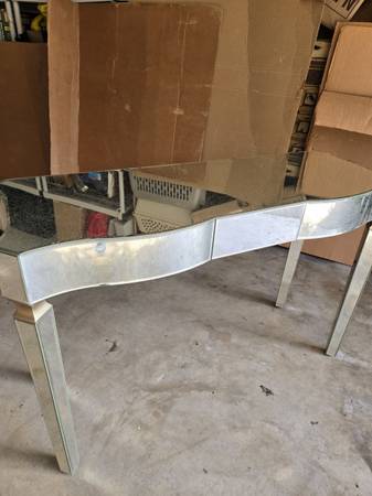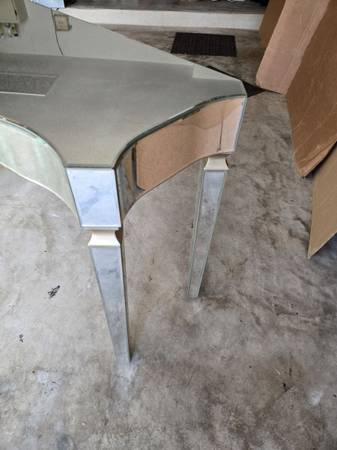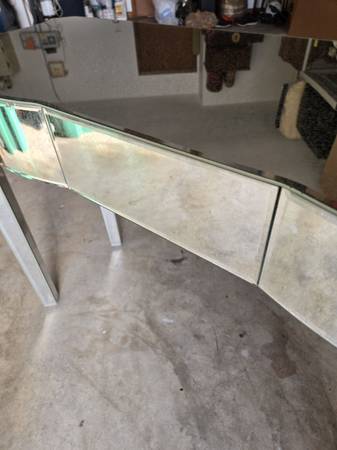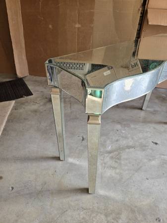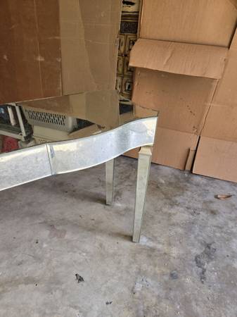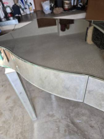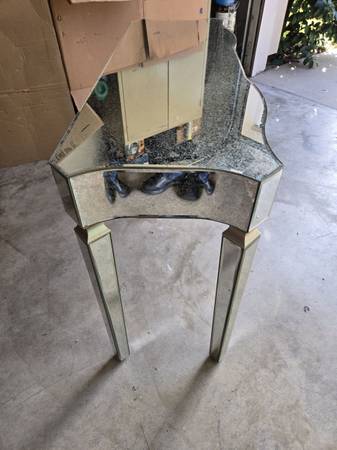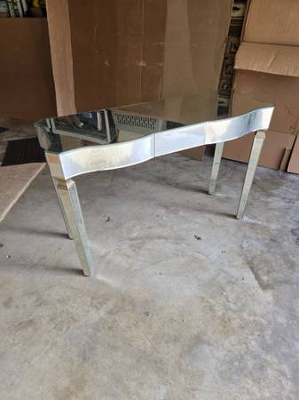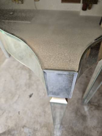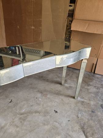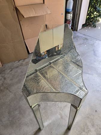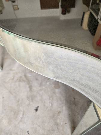 Beautiful custom design smoked beveled mirrored console . There is one small break on the back bottom of left leg in the back, as seen in my pictures. The console is 30" tall - 46" wide - 16" deep....