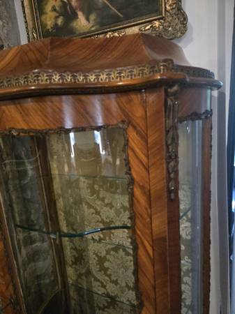 Amazing Mid-Century 20th Century Louis XV style Vitrine. Beautiful marquetry satinwood appearance with a lot of bronze framing. Custom glass door & both sides have glass as well. The top is flat which makes it a wonderful display area. Three thick glass shelves. Elegant gold fabric on the back of the cabinet & bottom. Has a lock & key. There is some wear due to its age as seen in my pictures. It is 64" tall - 28" wide - 18" deep. local only - cash only - in-person only