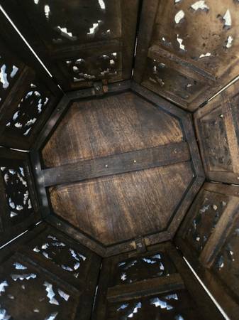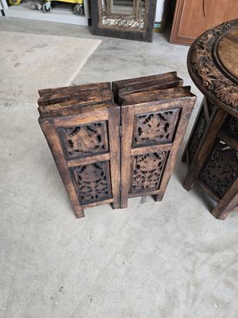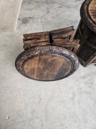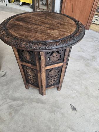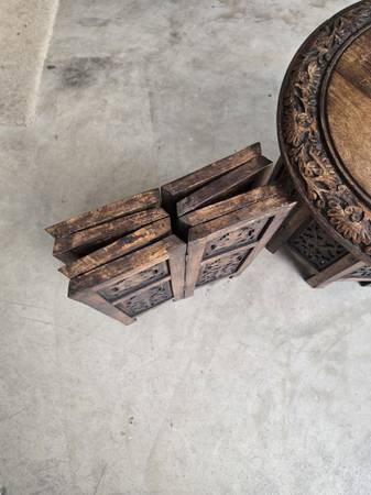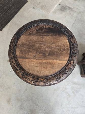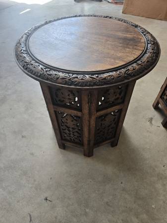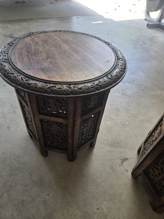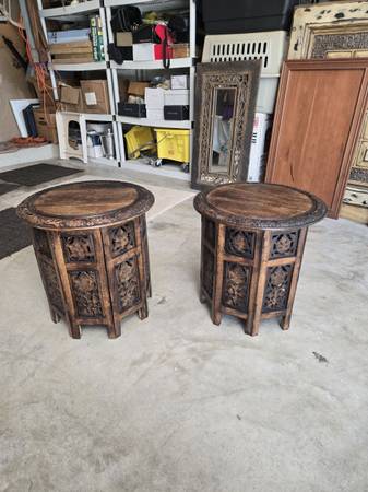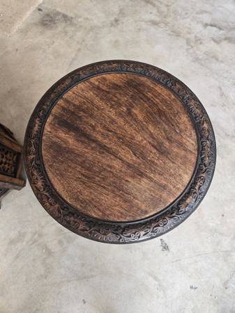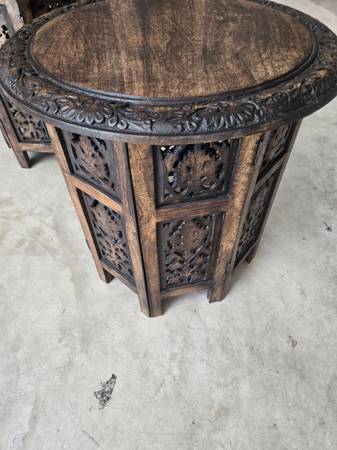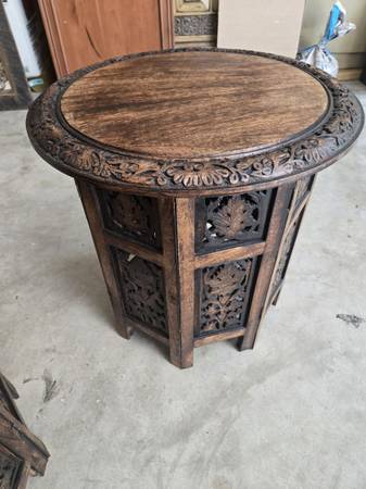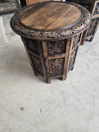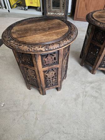 Carved Mango wood tables with 18" diameter round tops & octagon bases. They have a walnut finish. They have some wear as seen in my pictures. They are 18" tall. The bases are made up of eight carved wood panels with hinges. The top can come off & the bases folded for storage.