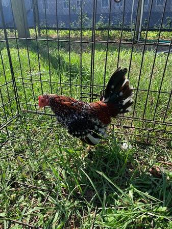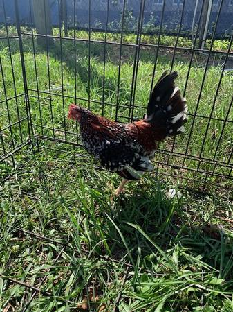 For sale Old English Bantam Spangled Cock. Asking $25.00 cash. You must pick up. If interested text