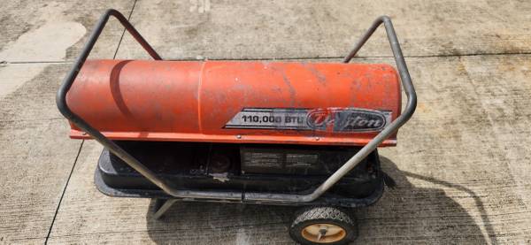 The winter air is coming. This heater is used but works great. This would be great in a garage or an outdoor space heater. It is 110,000 BTU rating. Runs off of kerosene or diesel. $100.00