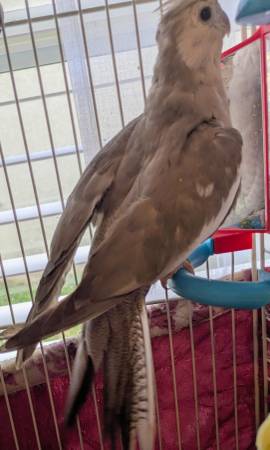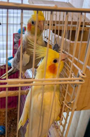 Gorgeous pair of cockatiels currently sitting on a clutch of eggs. The female is a super tame lutino beauty and her mate is a tame muted pied. Both are just over a year old. $200 for the pair of birds only.