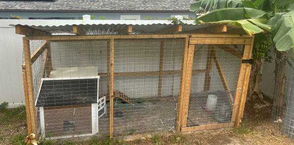 Wood and wire animal enclosure with tin roof. We have used it for bunnies but could but used for chickens or any other small animals.