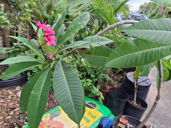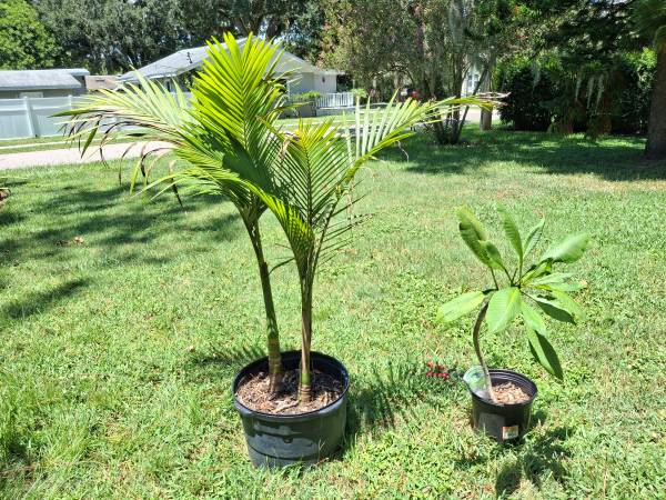 As you can see in the picks that these two will add a nice tropical atmosphere to your yard as they grow taller and the flowers and the Red seeds appear on the Palm Tree. The Palm is a Double or a Triple (3) and is self cleaning and an easy grow. The Plumeria is also self cleaning and you can shape it and make cuttings from it as it matures. Contact me with any questions and pickup is preferred but delivery is available after discussion of your location. A bag of Black Cow would be an excellent soil additive when planting.