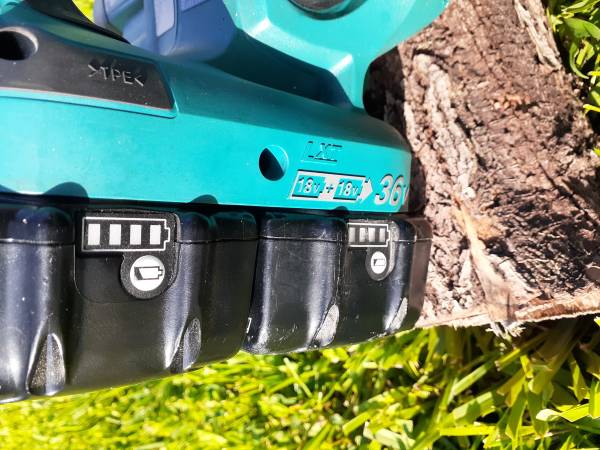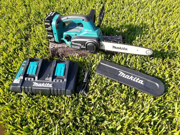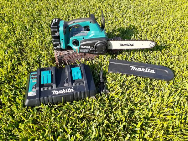Makita 36-volts top handle chainsaw. 12" bar and chain. Tool-less chain tensioner. Adjustable oiler. Made in Japan. Includes two 5ah 18 volts batteries and dual port fast charger. Excellent...