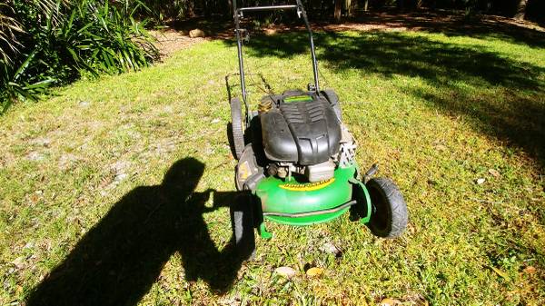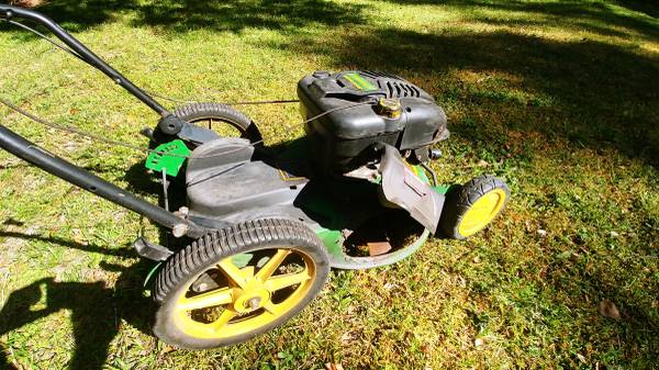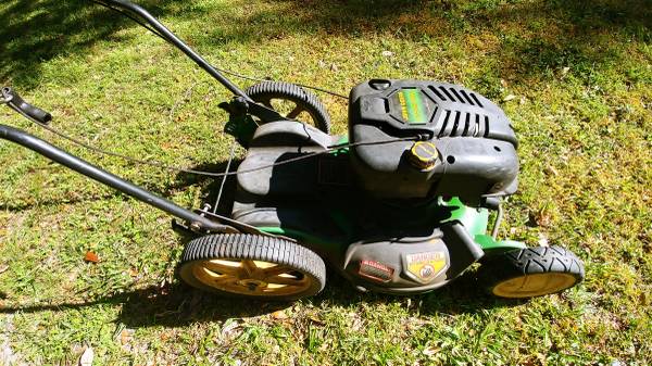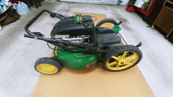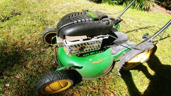 JOHN DEERE PUSH MOWER 6.75HP JS60H 21 INCH BLADE. NEEDS A CARB. Turns over, will not start. Because it was run with ethanol and not ethanol free gas it now needs a carb. repair or replacement. Recent oil change as well as the air filter and spark plug were replaced. Needs a new blade if you are picky about not tearing the grass blades while mowing. It is designed to be a mulching style mower, but you can wedge the side discharge door up/open (see pic,) and the grass shoots out the side, I am the original owner of the mower and can answer any questions about it. It is not self-propelled. Has the high back wheels that make it easy to push through St Augustine grass. The handles fold down so that it can be easily transported in small SUVs, including some trunks of cars.