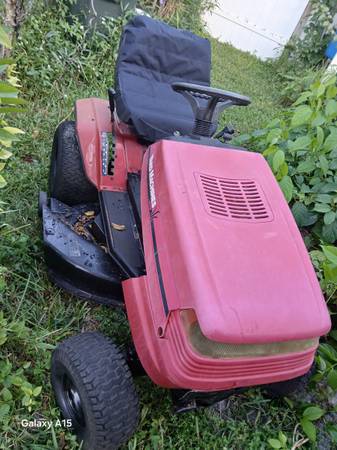 Yard machines riding mower tractor Needs battery and new gasoline and a carb cleaning to get her started was running earlier this summer. It turns over with jumper cables. Deck is in great...