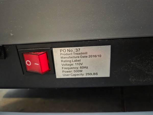 Small, relatively lightweight treadmill in need of a new home. Doesn't seem to have a brand or model. The only labeling is shown in one of the photos, next to the power switch. I powered it on and it functions, but I didn't test it beyond making sure the belt moves. With low effort, it folds up and doesn't take up a lot of space.