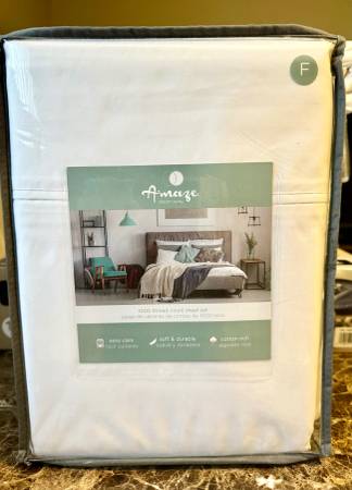 New, unopened full size white sheet set. Consists of a fitted sheet, flat sheet and two pillowcases.