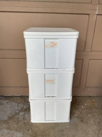 white plastic basket framing drawer unit, has 3 drawer bins, unit is 16.75” x 15.25” x 36”, minor wear