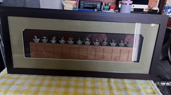 Chinese Money Zodiac wall art. Dimensions: 34.6" x 15" x 1.6" In good condition. A few spots on frame that are distressed.