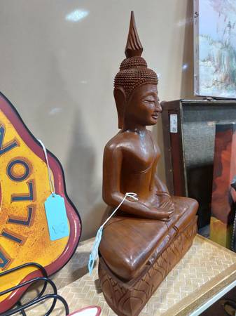 Hand-Carved Wooden Buddha Statue 21.25″ tall • 10 lb 3 oz Peaceful Meditation Pose. Likely teak or mahogany Can be purchased at Treasure Marts in Mount Dora FL. Booth H8 New Path Treasures. 2728 W...