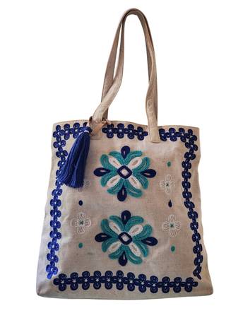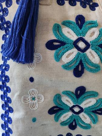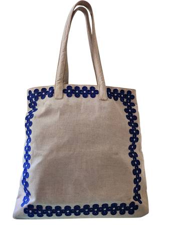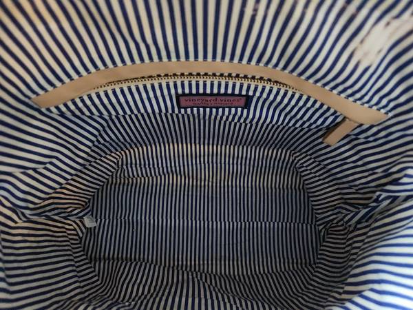 VINEYARD VINES HANDBAG ABOUT 15 INCHES TALL (NOT INCLUDING HANDLES) BY 14.5 INCHES WIDE TOP OF BAG IS NOT ZIPPER INSIDE HAS A ZIPPERED POUCH AND AN UNZIPPED POCKET OUTSIDE HAS A BLUE TASSEL INSIDE...