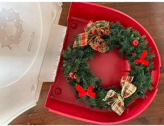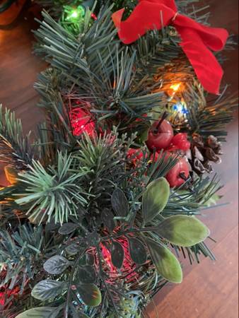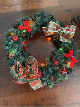 Beautiful semi vintage Door Wreath in excellent condition. Has working lights and is tastefully decorated. Includes a latching wreath storage container. Located near the Winter Garden Village.