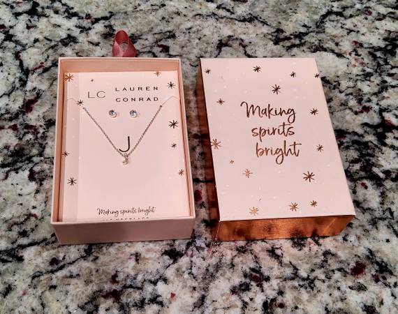 New In Box Lauren Conrad Making Spirits Bright Initial "J" Pendant 16 Inch Silver Chain Necklace And Post Earrings Set has never been removed from the box and still has sticker label on the bottom. This charming set features a delicate 16 inch necklace with pendant and matching stud earrings in silver tones with crystals, making it a perfect personalized gift for yourself or any family or friend with the initial "J".