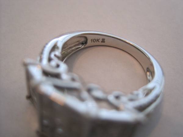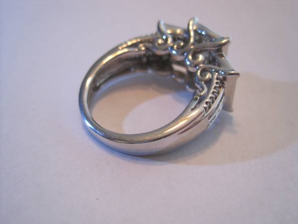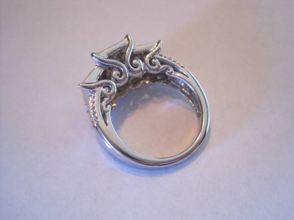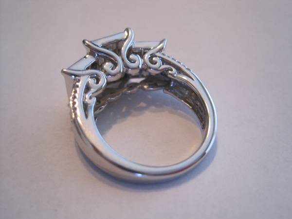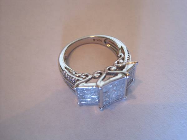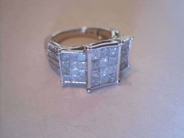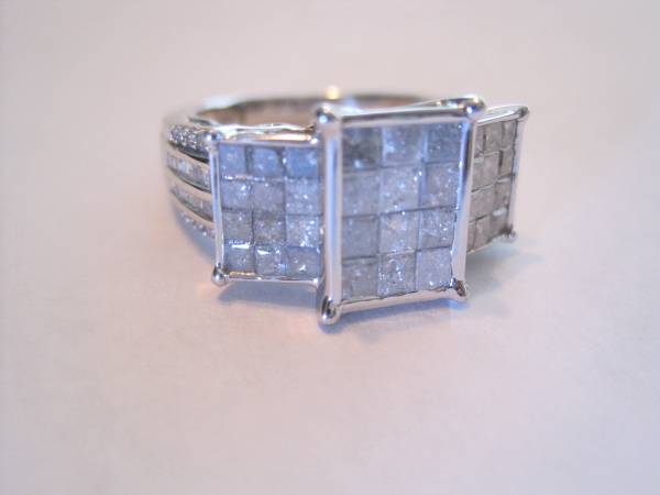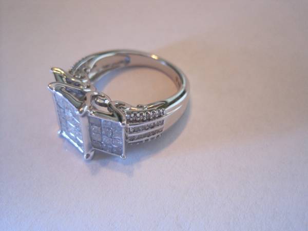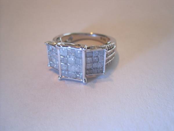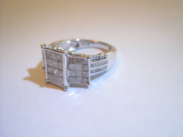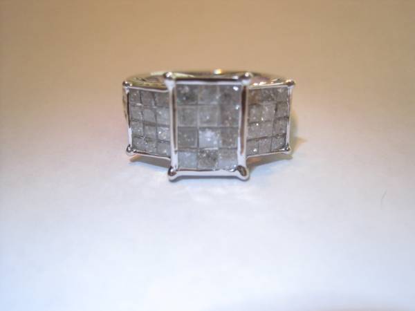 This ring was $1,200.00 when purchased new. Gorgeous, size 6.25, women's 10K white gold Princess Diamond Cluster ring. approx. 2.00 Cttw. Combined diamond weight of 2.00 carats total weight. 80 diamonds in total. The top tier of one dozen diamonds and dual left and right side, twenty four diamonds are flanked by 24 baguette and 24 round channel set diamonds cascading around both sides. This is fine solid gold not gold plated or gold filled. In excellent condition and absolutely clean, ready to wear.