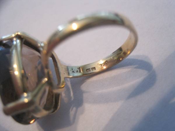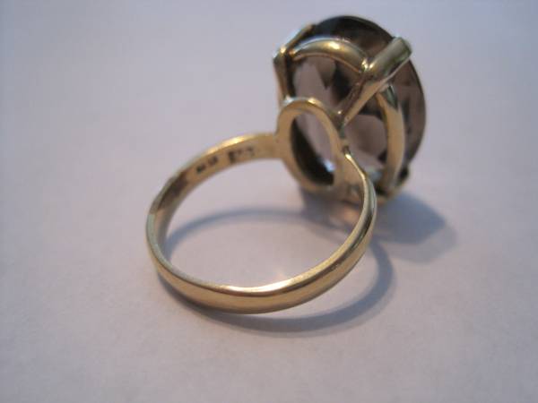 Very good condition gorgeous18k Yellow Gold Vintage oval Smokey Quartz cocktail ring size 6 to 6-1/4. This is real solid 18 K gold not gold filled or gold plated. Beautiful large oval smokey quartz prong set stone. Hall marked with the maker mark, Great British Jewelers (GB), 18K (750). Acid tested in two different places and tests a little above 18K.