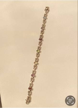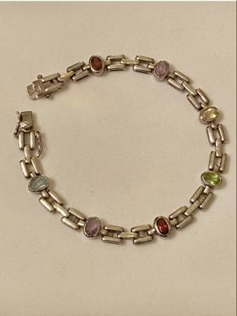Beautiful gemstone bracelet stamped 925 measures 7 inches long with a double safety clasp. The back of the clasp is marked DBJ (Dee Berkeley Jewelry) and features topaz, peridot, garnet and citrine stones. Includes original gray velveteen bracelet box. Estate quality. Thank you for looking.