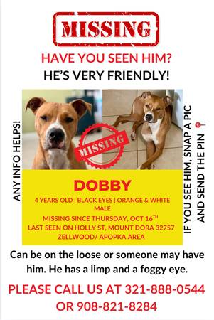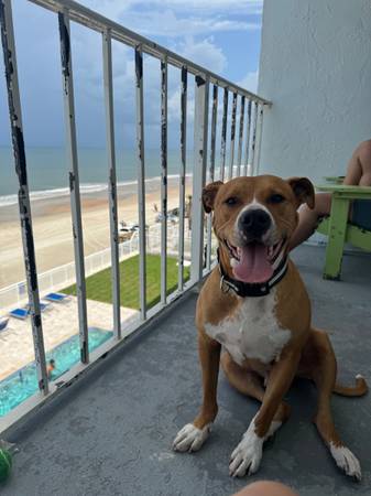 Orange pitbull/hound mix. Slight limp (one front leg longer than the other), white on chest, paws, snout, and tip of tail. Has a foggy eye went missing on 10/16. We are offering a 2k reward