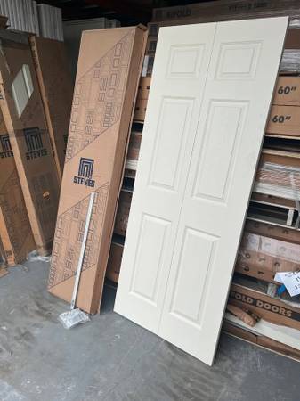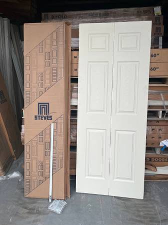 New 32in x 80in 6 Panel Wood Texture Bifold Door with Hardware.