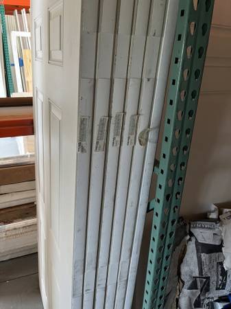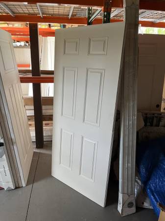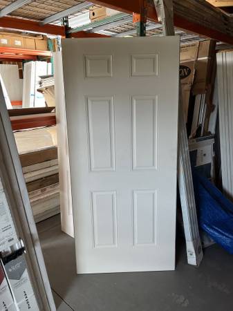 New 36in x 79 1/4in 6 Panel Smooth Fiberglass Exterior Door Slab. Hinges are mortised as shown in the pictures. I have 7 of these available. $150ea