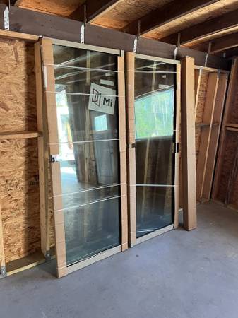 New 60in x 80in (5/0 x 6/8) Mi Almond (Tan Color) Sliding Glass Door 420 Series Aluminum Slider. Double pane, low-e, argon filled, and tempered. Track and frame set included. The frame measures 60in x 80in, the manufacturer recommends a 1/4in bigger all around for the rough opening. I have 2 sets available.
