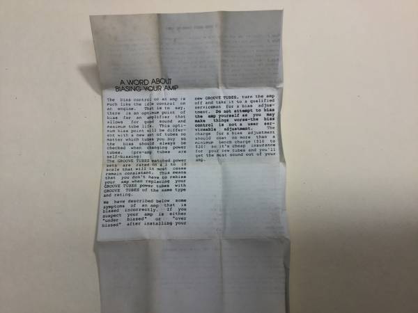 NOTE: Your amp will have to be biased when installing the tubes by a Tech. Not biasing the amp will damage the tubes and the amp will sound terrible. Instructions are included in the packing. If you are running 6550s a bia resistor will also have to be changed.