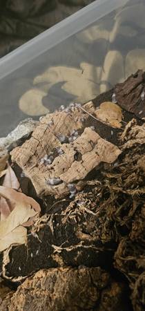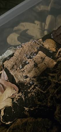 They thrive in high humidity of 75-85% with temperatures of 72-82°F (22-28°C) and within a moisture-retentive mix of organic soil or coco coir, crushed oak leaves, and sphagnum moss. This combination should be at least 3-4 inches deep and include leaf litter and cork bark on top to provide a habitat for hiding, burrowing, and eating.