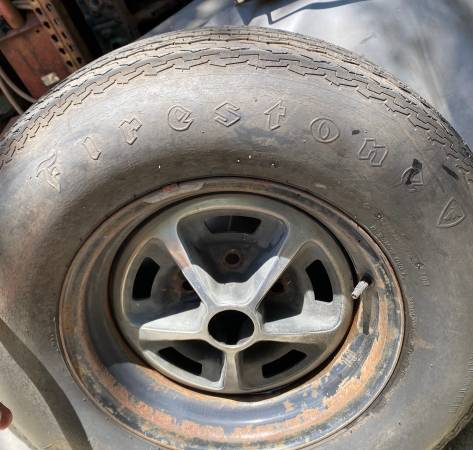 For Sale. Mopar Chrysler OEM original car 14” x 7” road wheel with Vintage Firestone Tire. Most likely was a spare out of a car. Still has the chrome/black paint. No center cap or beauty ring. Wheel is in great shape for age. I’m asking $75.00 for it. Please, message me if you have any questions. Thanks.