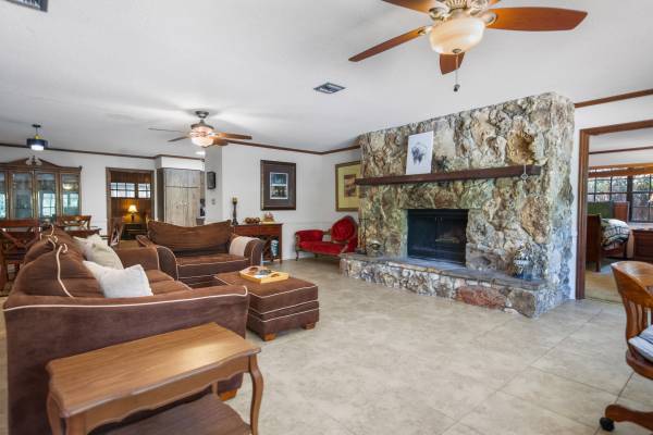 Welcome to the delightful little town of Howey in the Hills! A quaint community nestled between Clermont and Tavares. Just around the corner from the historic Howey Mansion, this spacious 1978 ranch style home has 2,366 square feet of living space, sits on a 1/3 acre corner lot and has no HOA! The circular drive has nostalgic oaks and mature landscaping framing the vintage brick and hardwood exterior. Quality of construction and of course location are the home owners favorite features about his property. We encourage you to look in the attic at the hearty wood slats and craftsmanship of this time, definitely not cookie cutter! Currently a more masculine vibe, but don’t overlook the bones of this expansive layout to create a transitional, classy space. The rooms are large and the possibilities are endless. An original stone fireplace adds a rustic appeal and real wood fire warms most of the living space! The hearth is a cozy spot to sit and the mantle spans the wall to display your favorite things! The home has 2 primary bedrooms with ensuite baths, huge closets and ample windows. The 3rd bedroom option measures 25 x 15, located just off the kitchen. Currently used as a family room and storage, super cozy with tongue and groove ceilings, antique furnace and access to the screened porch. The laundry/hobby room could also take on another purpose, point being the square footage is there to create the space you need inexpensively. The main great room is massive, with large built-ins hiding even more space! The kitchen is positioned perfectly to enjoy everyday activities with tons of room to expand! Great the way it is, but why not capitalize on the potential of your next investment?! The rear entry garage means an extra driveway and a private place to tinker and do projects! You will also be sharing a zip code with the world-famous Mission Inn Resort, this means you are literally minutes away from a full service spa, (2) 18-hole golf courses and 4 specialty restaurants! A wedding destination for some will just be Sunday brunch for you and your family! Another special treat is the Yalaha German Bakery! Properly named Lake County, “Howey” sits along the shores of the Harris Chain of Lakes. Whether you’re into boating or fishing, you’ll love the ability to visit different cities and even access the intracoastal waterway! A favorite stop is Historic Downtown Mount Dora, a destination city for boutique shopping, dining at restaurants like The Goblin Market and Pieces Rising and events year round! HVAC 2018, water heater 2021, Drain Field 2021, tile and carpet. Florida’s Turnpike is just 5 miles away on Hwy 27 with convenient access to Winter Garden and Greater Orlando.