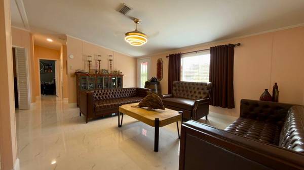 A Must-See Corner Lot Gem! Step into high-end comfort and timeless style in this stunning 4-bedroom, 2-bathroom luxury home, ideally located in the highly desirable all-age Carriage Cove community. Just a short walk to the community pool and amenities, this corner-lot beauty offers a perfect blend of convenience, elegance, and modern functionality. Inside, you'll be welcomed by luxury porcelain marble tile flooring throughout, setting the tone for the home's refined aesthetic. The open-concept layout is complemented by quartz countertops, tiled showers, and premium appliances, creating a chef-inspired kitchen and spa-like bathrooms. The primary suite features a soaking tub for ultimate relaxation, while all bedrooms are generously sized for comfort and versatility. Enjoy year-round climate control with a brand new 5-ton AC unit, window AC in the enclosed patio, and stylish fandeliers that offer both lighting and airflow. Additional upgrades include new toilets with bidets, enhanced insulation throughout, and a roof less than 10 years old. This home also features: A covered carport for convenient parking, A storage shed for added space, A built-in security camera system for peace of mind, A dedicated BBQ patio perfect for outdoor entertaining. Situated on a street-facing corner lot, the home is framed by lush, manicured landscaping, enhancing its curb appeal. Whether you're relaxing in the enclosed patio or enjoying the nearby community amenities, this home is designed for elevated living. Schedule your private tour today; luxury, location, and lifestyle await you in Carriage Cove! Apply today and Call now show contact info