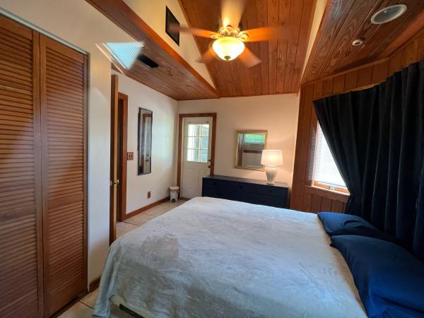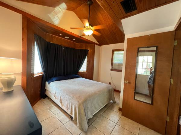 Furnished room with private entrance. Queen sized bed and dresser. Ceiling fan. Tile. Large shared bathroom (mostly private). Shared common areas. Lake access. Laundry off site.