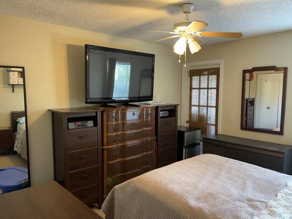 Furnished (Bed, nightstands, small fridge, Tv) OR Unfurnished, ceiling fan (See pictures).