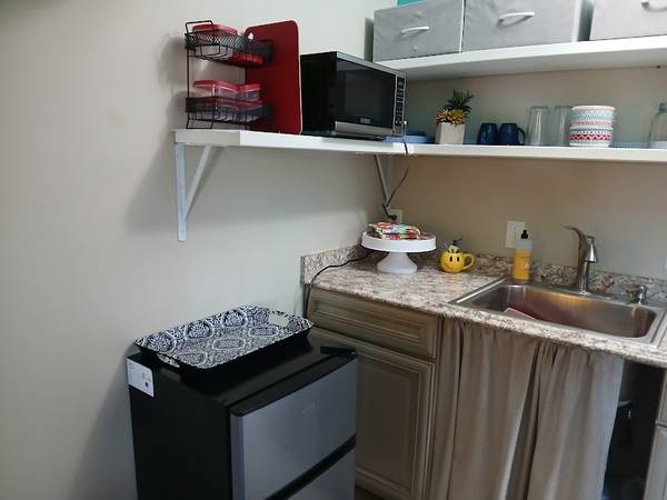 Efficiency includes small kitchen with large sink, refrigerator, microwave, and dishes. Room has a private entrance from the garage. Price includes electric, water, pest control, and internet. The room includes twin size bed, desk, desk chair, dresser, and linens. Rent is month to month. Move in is $1,000 plus $500 refundable deposit.