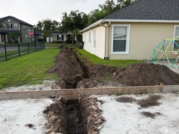 French Drain Prep: Trenching and placement of 57 Stone for effective drainage.
