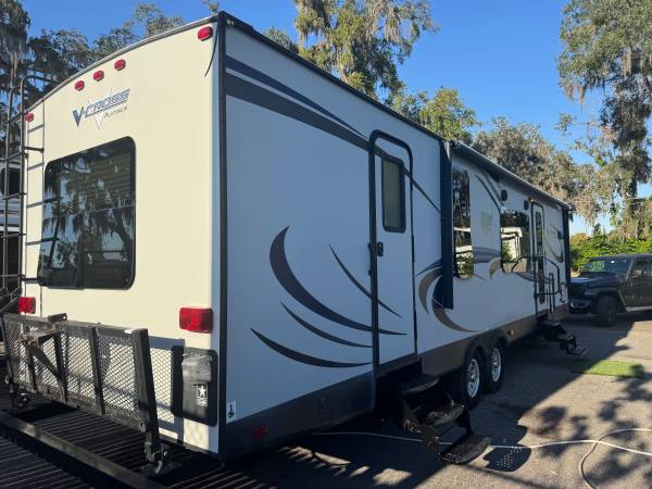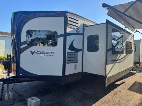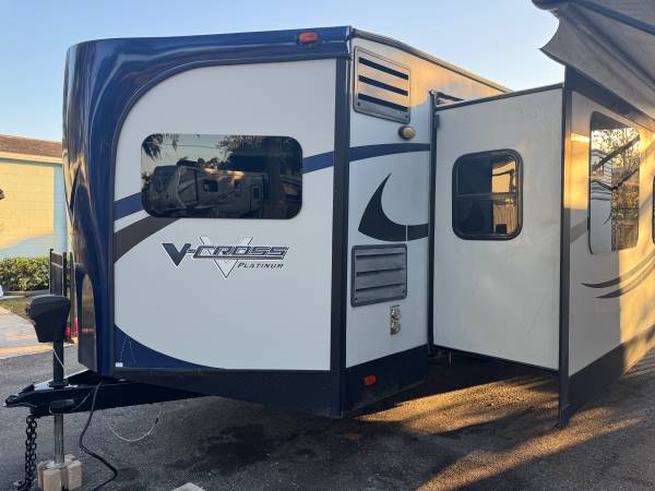 SOLD! We have a 2016 Coleman Dutchman 2 bedroom handyman available can text Bridgette at 321-388-6734 or call 407-473-9311. Delivery available. Good opportunity on 36 ft 2 slide fiber glass body Forest River V-Cross RV. Clean title. Home like spacious wide living room, fireplace, front kitchen with window views, nice stone counter top real wood cabinetry. Everything in working order .Cold air, electric, refrigerator, appliances slide outs, water . flat screen tv included, large rear private wall around master bedroom with built in furniture. Walk thru big bathroom with shower toilet & vanity. 2 entry doors.& awning. Offered for Less then half the used retail value due to soft spots along the floor & soft wall by dinette. Would make an amazing storage facility. . Could make a fun fixer up guest/vacation home or be used as a large super sized cold air storage unit. Handyman could put plywood over soft spots or leave as is. Call Weekdays Dena 407- 252-5587 can text/call.