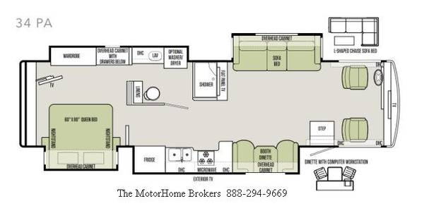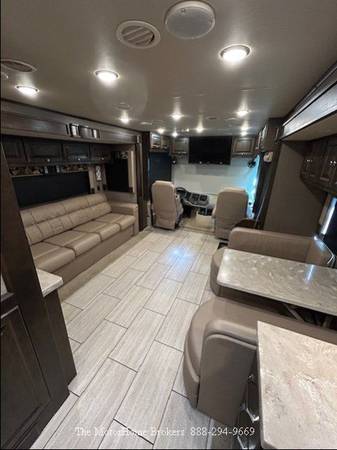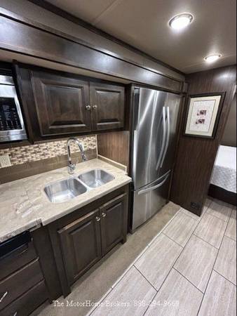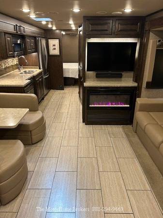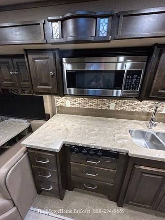 The spacious and stunning interior is enhanced with opposing slide-outs. tile flooring, with a large 4 cushion sleep sofa, electric fireplace, full entertainment center with a large LED TV, home theatre system and an in-motion auto satellite system for your enjoyment. The drivers compartment has full instrumentation including rear & side view monitoring, navigation, R/H chrome mirrors, satellite radio, pwr. shades, power ultra leather seating and another LED TV in the overhead area. The equipped galley has solid surface countertops, custom backsplash, beautiful walnut cabinetry, stainless steel appliances including a residential French door refrigerator with icemaker, a convection microwave, a 3 burner LP cooktop, a slide-out pantry and a nice booth style dinette.